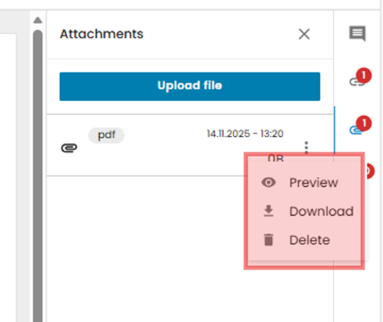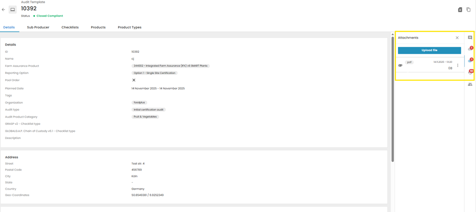 After issuing the certificate, the generated Audit PDF is automatically stored in the Attachments section of the audit screen. Here, you can preview, download, or delete the PDF as needed.