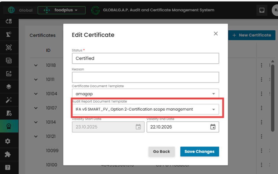 When issuing a certificate in the COS system, it is essential to select the correct Audit PDF template that matches the audit’s FAP (Farm Assurance Product) and option. The system contains all required templates, so you should: