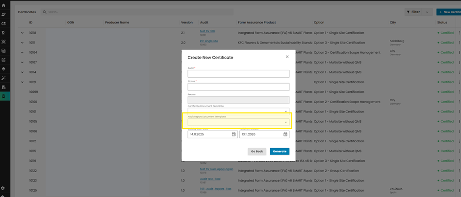In the certificate creation dialog, choose the Audit PDF template that corresponds exactly to the audit’s FAP and option.