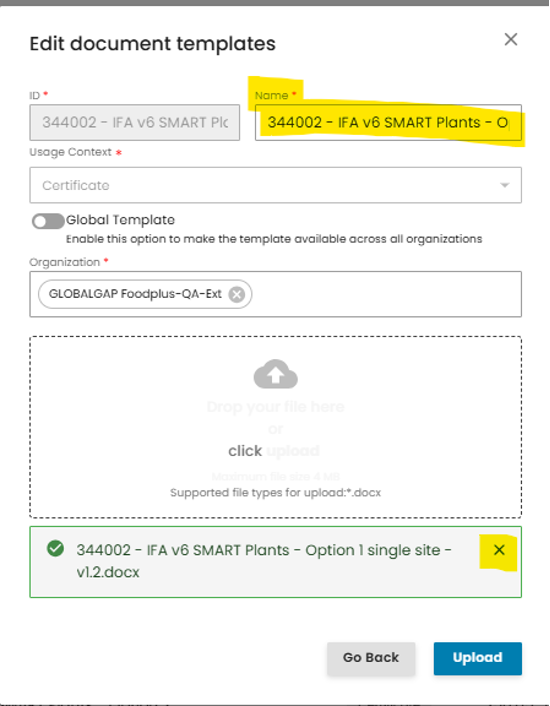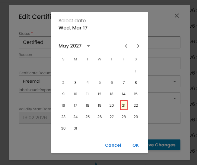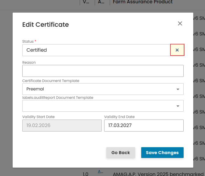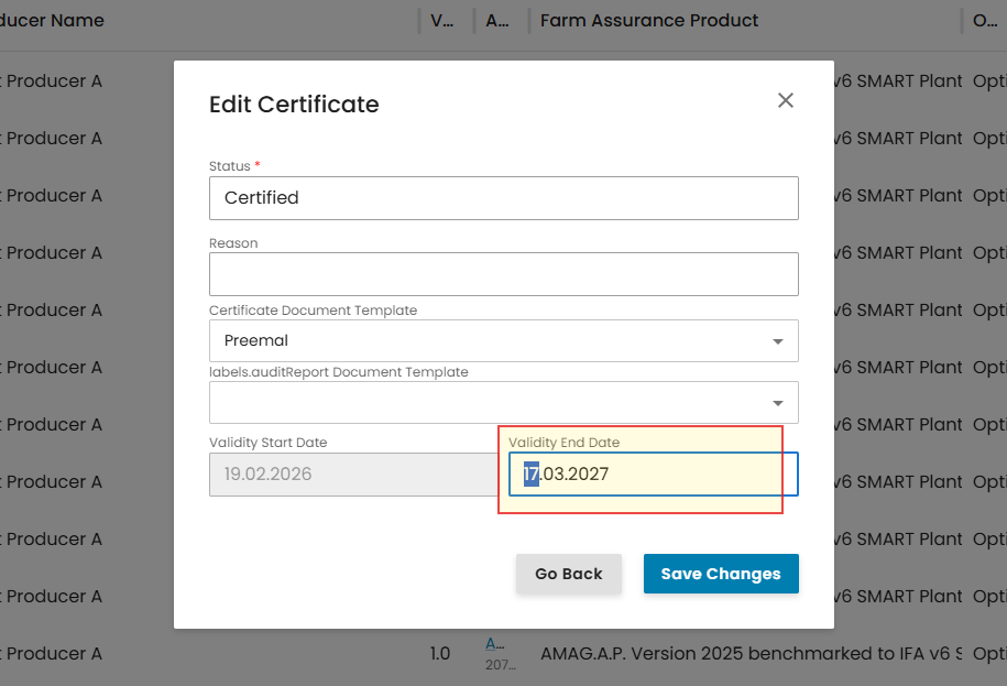 Next, you need to select the new validity date based on the provisions of the GLOBALG.A.P. GRs and press “Save Changes”: