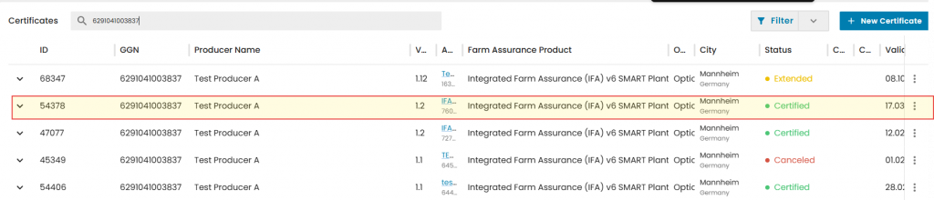 For comparison, certificates that have been migrated from the GLOBALG.A.P. database have a Certificate ID similar to this number: “1432624-241002”.