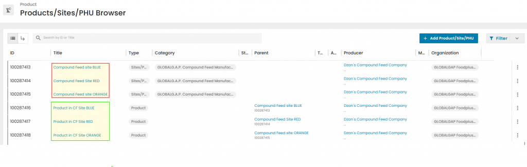 In our example, we will select the product “Compound Feed for Aquaculture” (ID: 11189), select under Parent the site we have created before, add our CB under Organization and press on submit: