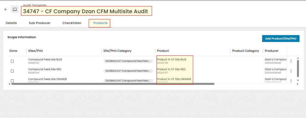 Next, add created Compound Feed Scope Products from registered CF Scope Sites to the Audit under "Products" list.