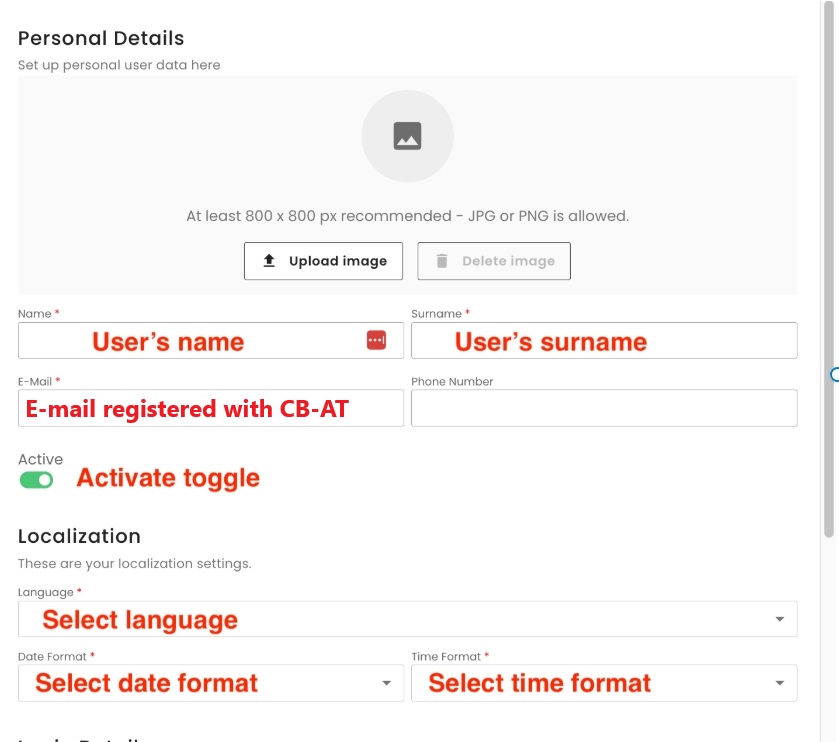 Please note: Users for the Preprod (test) environment are created directly by the Customer Support Team. Please send us your request with the following information for each required new user: