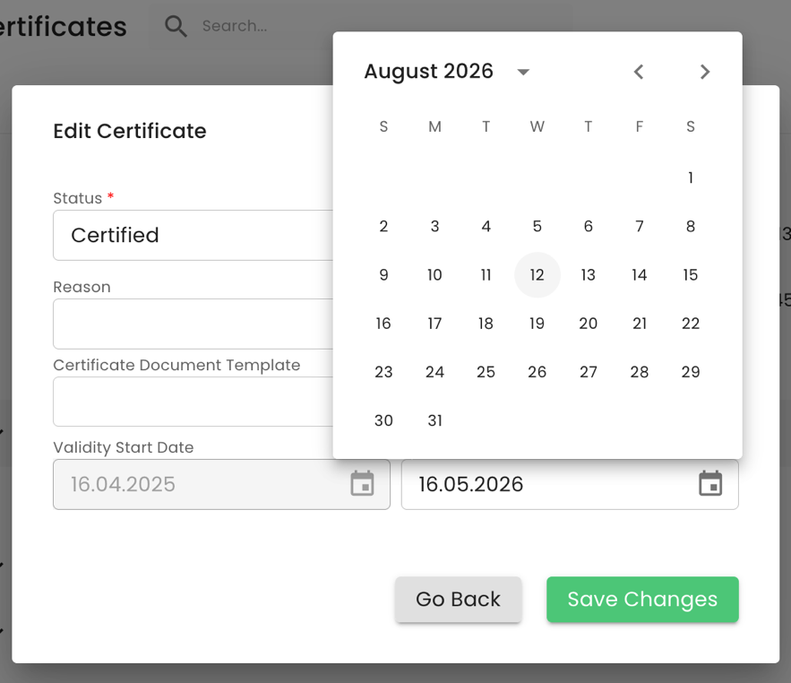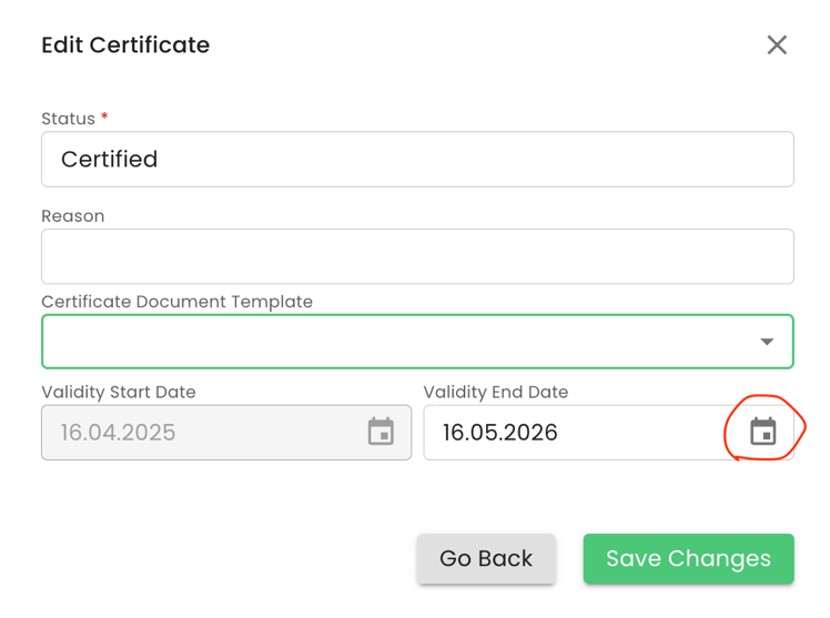 Next, you need to select the new validity date based on the provisions of the GLOBALG.A.P. GRs and press “Save Changes”: