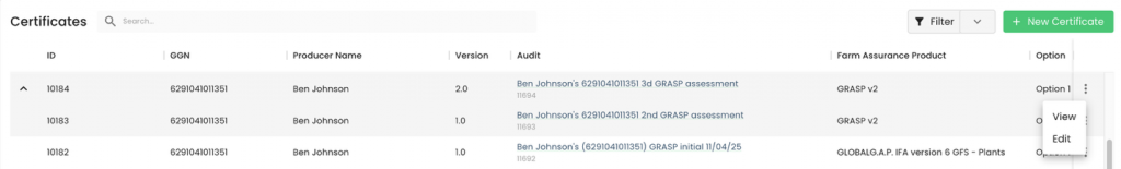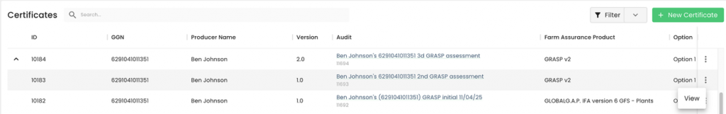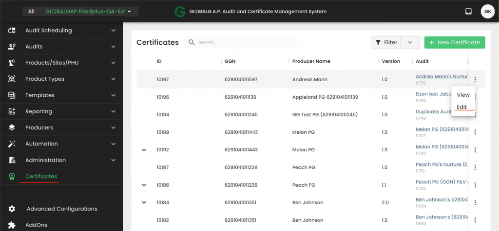 For comparison, certificates that have been migrated from the GLOBALG.A.P. database have a Certificate ID similar to this number: “1432624-241002”.