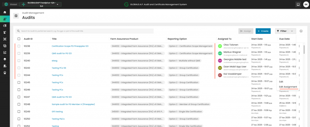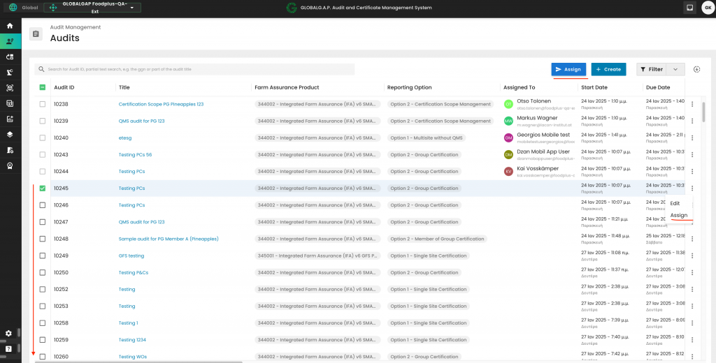 You will notice that once an audit is assigned, the tick boxes are greyed out. Via clicking on the three dots, you can edit the assignment: