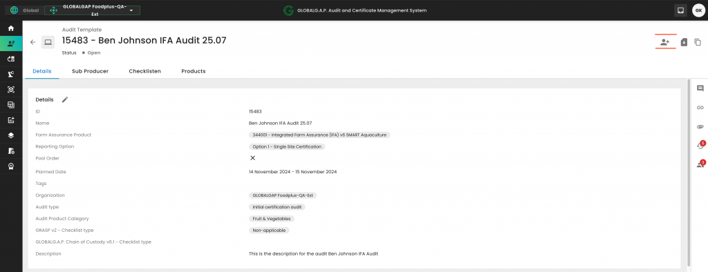 The left-hand side search can be used to search via "Audit IDs", a full-text search or a partial text search, e.g. the GGN or part of the audit/work order title.