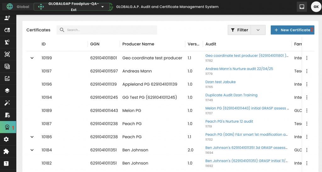 Under 'Certificates' and depending on your access rights, you can see the certificates issued by your CB. You can search by producer GGN and name, and by clicking '+ New Certificate', you can issue a new certificate based on a successfully completed audit/assessment. By clicking on the three dots on the right-hand side you can amend a certificate, e.g. extend it.