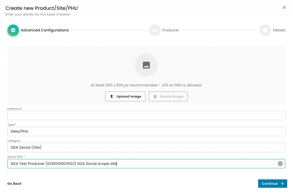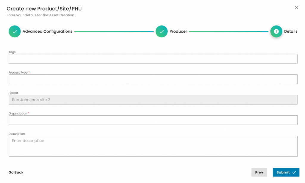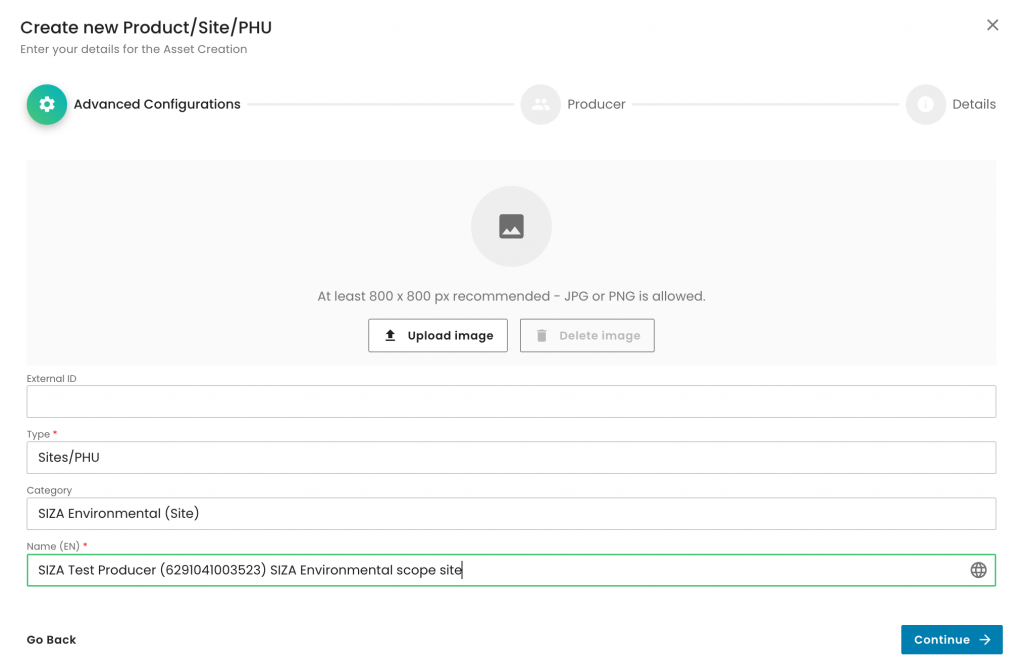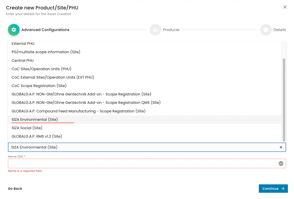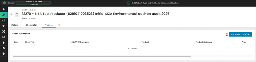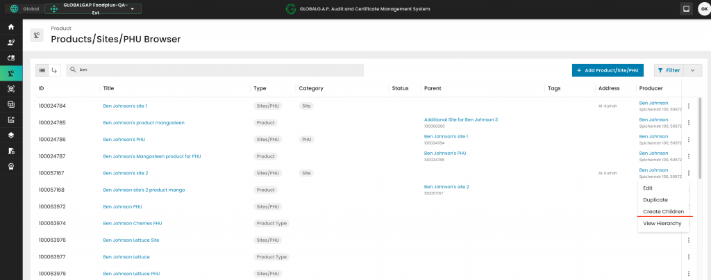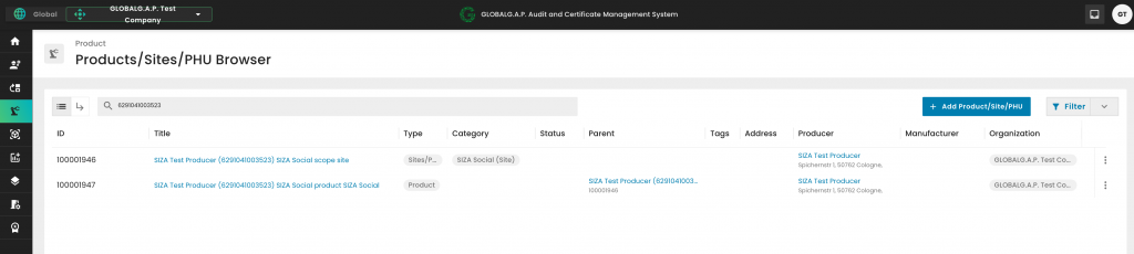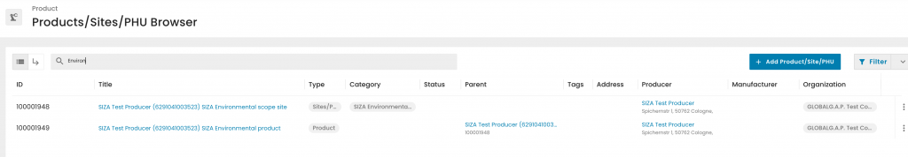 Under 'Product/Sites/PHU Browser' and depending on your user's access rights, you will see the sites (Production sites, PHUs and PG/multisite scope information sites) and products registered to these sites that have been created by your CB. By clicking "+ Add Product/Site/PHU", you can create new assets: