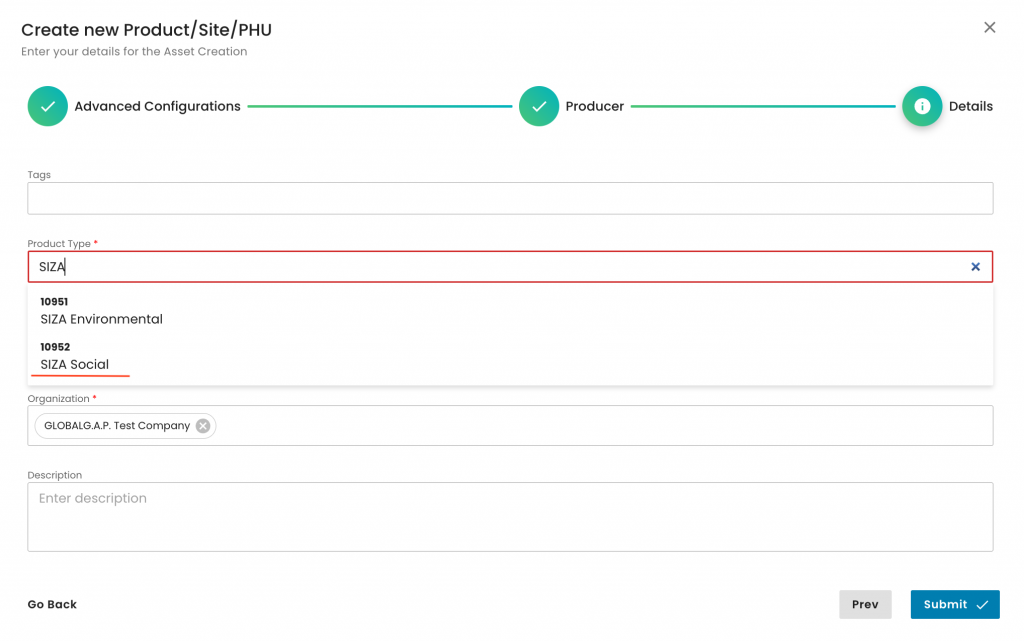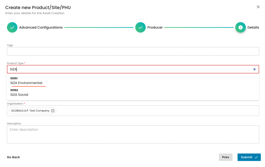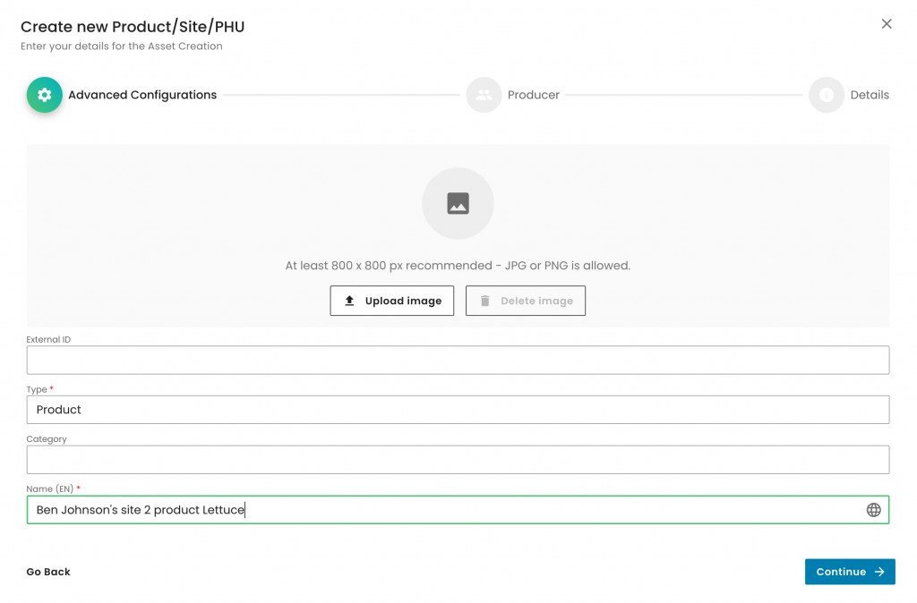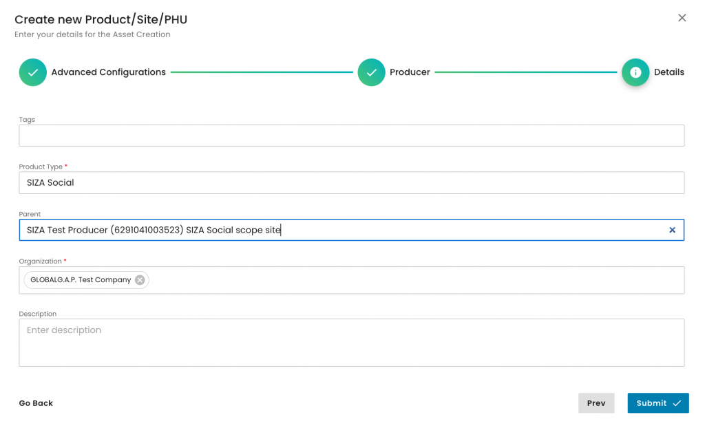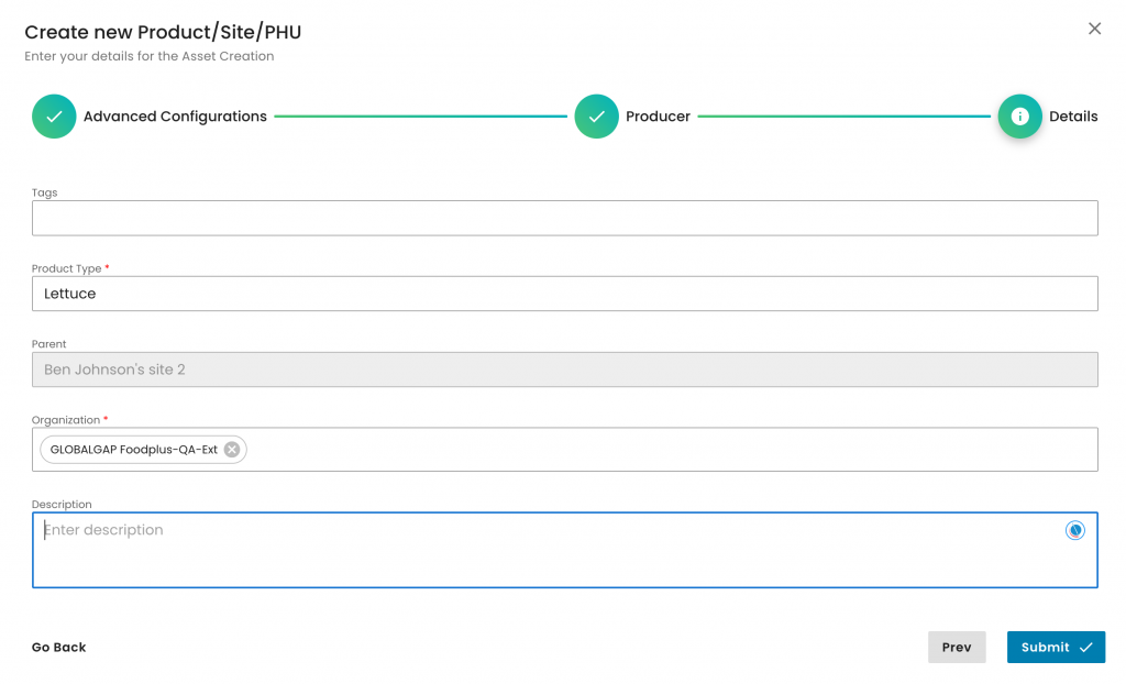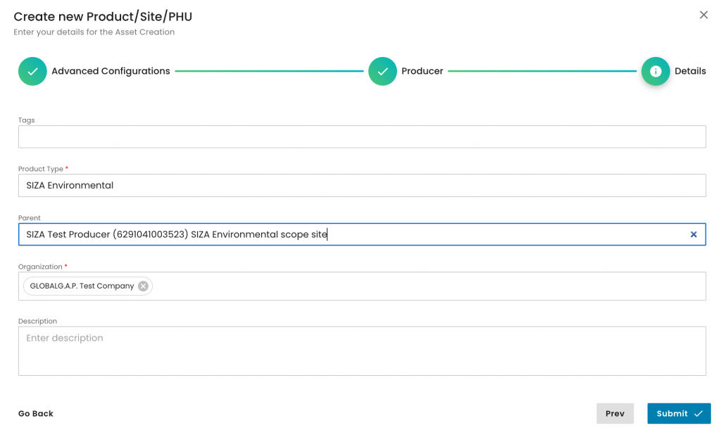 Under 'Product/Sites/PHU Browser' and depending on your user's access rights, you will see the sites (Production sites, PHUs and PG/multisite scope information sites) and products registered to these sites that have been created by your CB. By clicking "+ Add Product/Site/PHU", you can create new assets: