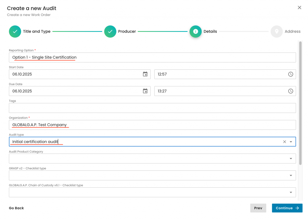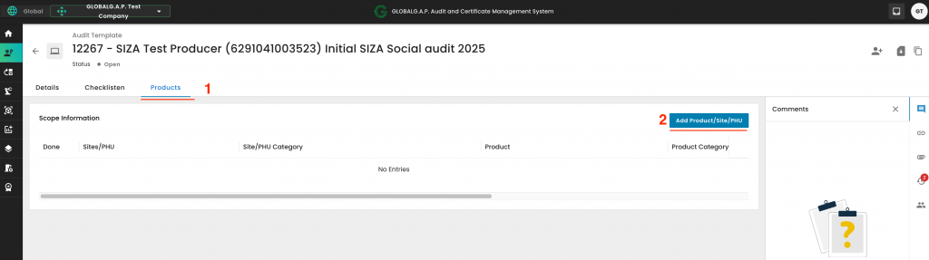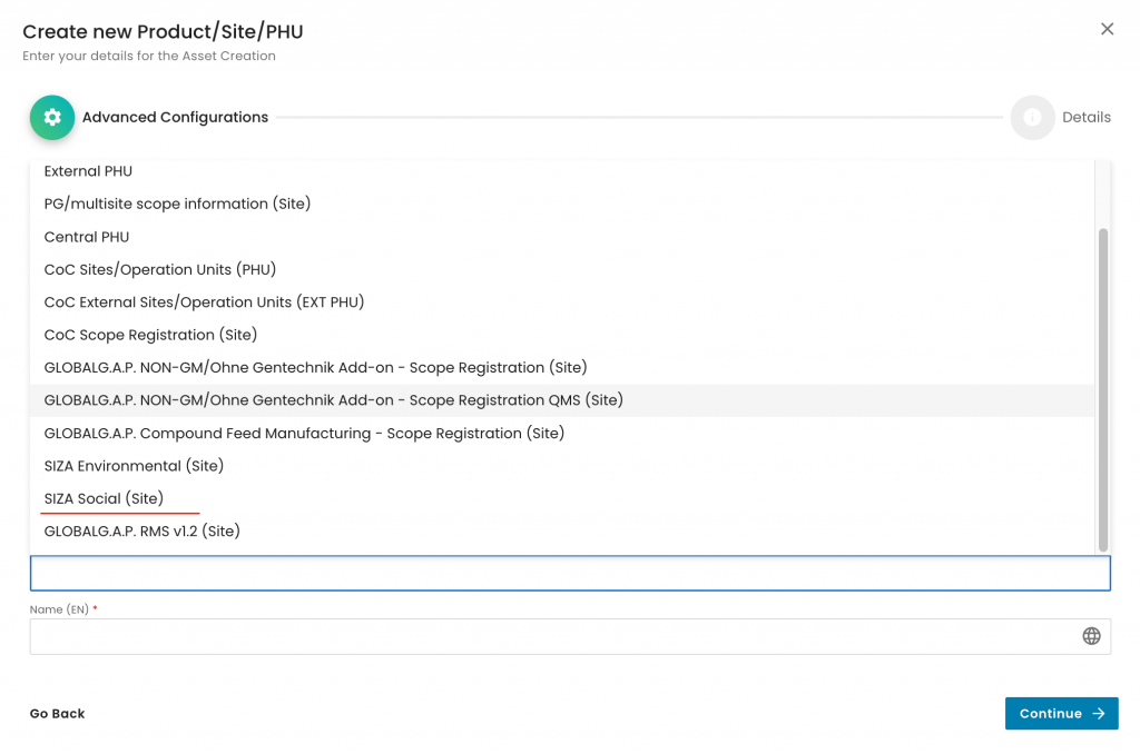 For GLOBALG.A.P. NON-GM/Ohne Gentechnik, the "Audit product category" "GLOBALG.A.P. NON-GM/Ohne Gentechnik Scope" must be selected. See here a detailed description of how to set up a Non-GM audit.