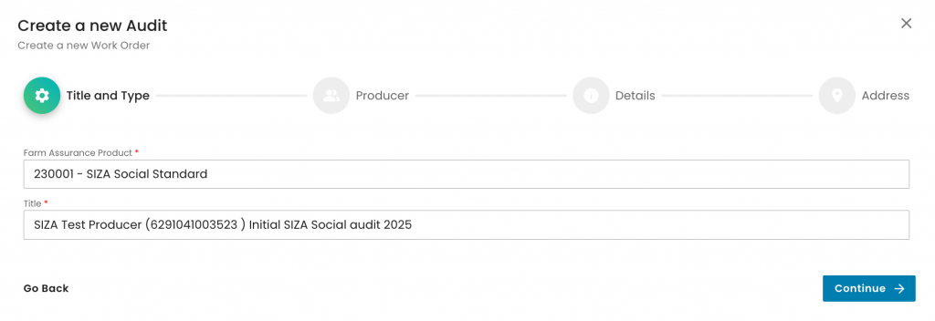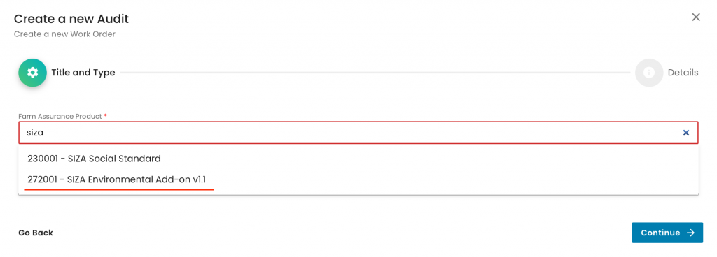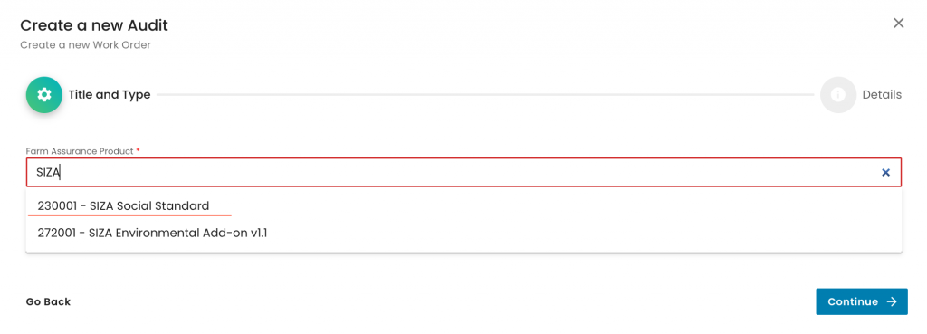 Select the applicable Farm Assurance Product and properly name the audit/assessment: and click continue: