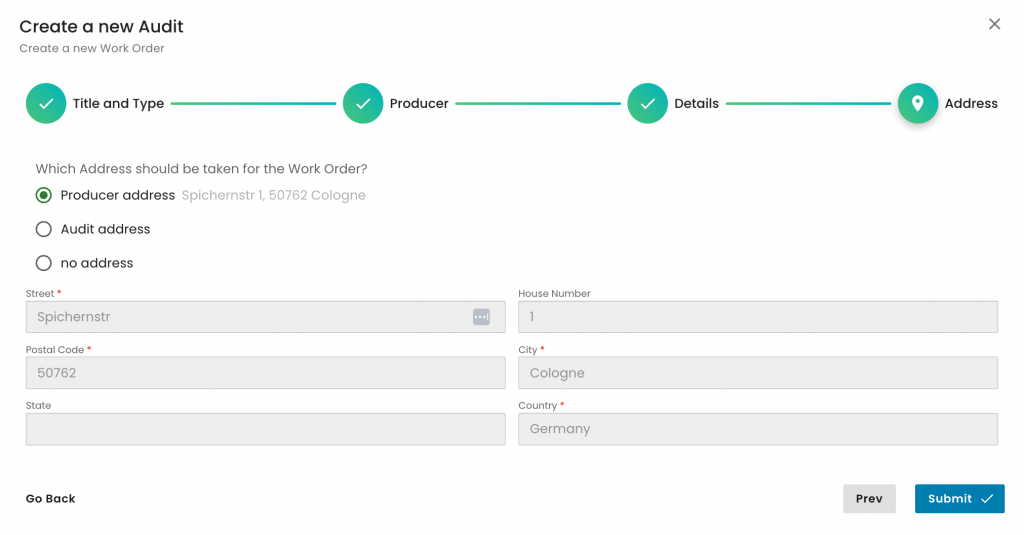 Under 'Audits', and depending on your user's access rights, you will see all audits (work orders) that have been created by your CB, or those you have created or been assigned to. By clicking "+ Create" you can start a new audit/work order: