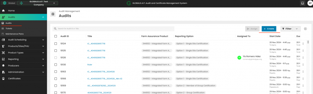 To create the modification audit/assessment work order you need to select "+ Create" from the audit section in CertifierOS: