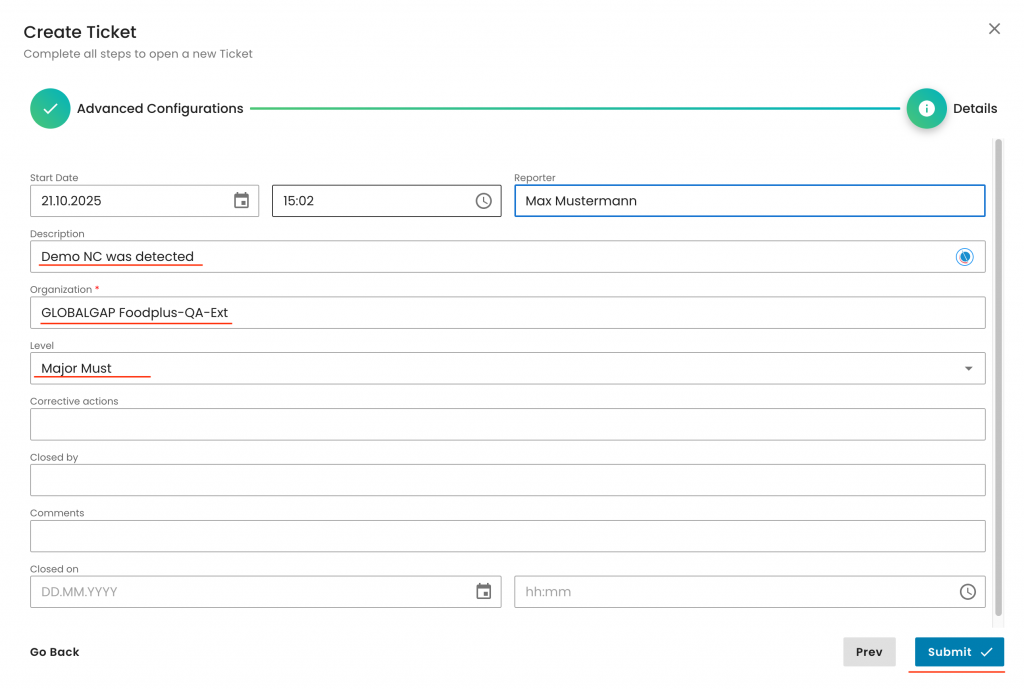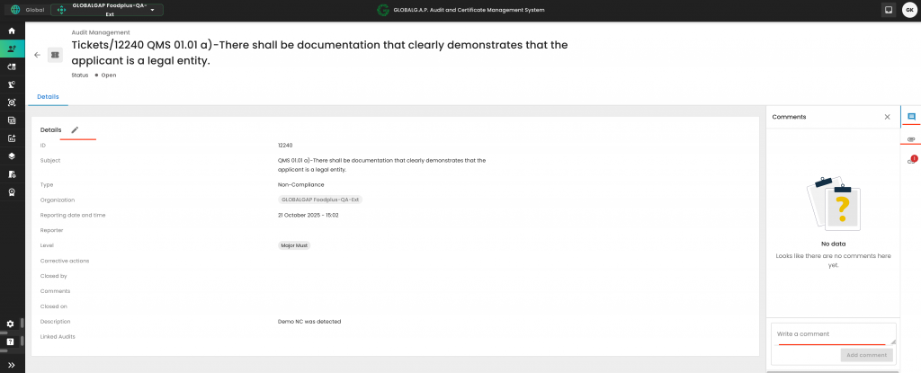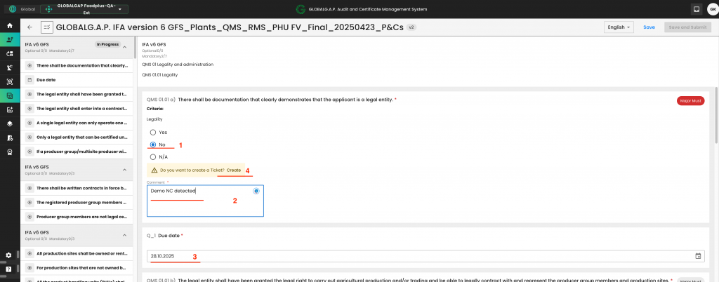 If an NC is raised, an additional field will appear below the comment section, prompting the user to enter a due date. To generate the NC ticket, click the yellow 'Create' button.