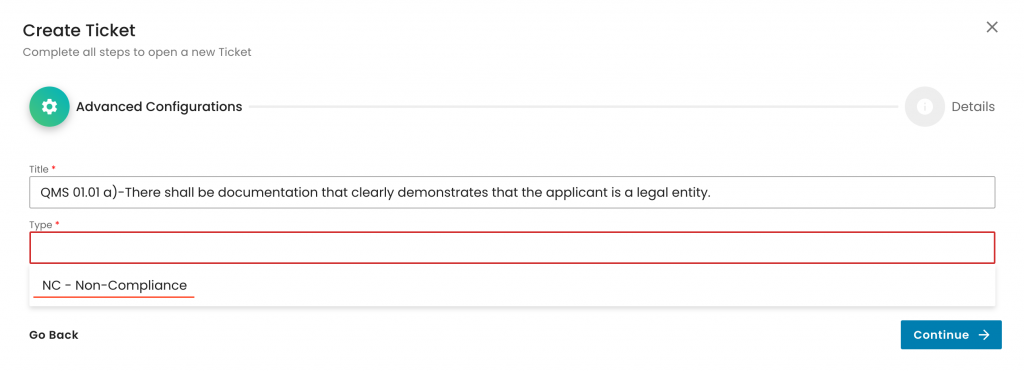 Under 'Tickets' and depending on your user's access rights, you will see all tickets (NCs) that have been created by your CB, or those you have created or been assigned to. By clicking "+ Create" you can start a ticket/NC: