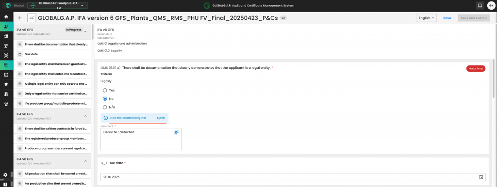 Under "Audit Peoduct Category" we select the appropriate option. Note that only for GRASP "Non-applicable" is the correct option. For other FAPs, it can be F&V, F&O, AQ, etc.