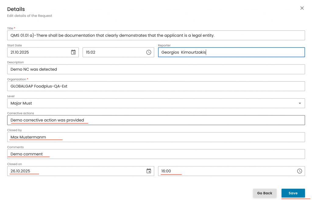 Enter the relevant information. Please note that fields such as 'Corrective Actions' and 'Closed By' should only be completed after the corrective actions have been received, in line with accreditation requirements.